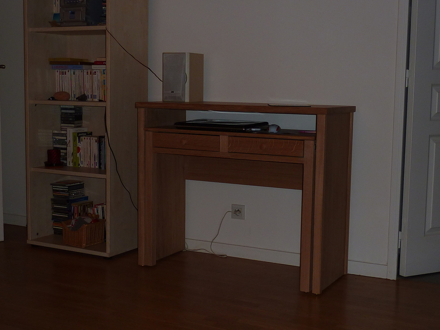 Bureau en deux éléments coulissants et deux tiroirs pour un gain de place le tout en chêne massif verni